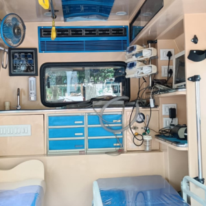 Designed for stable or non-critical patients. Equipped with stretcher, wheelchair, basic oxygen support, first aid kit, and trained medical attendants.